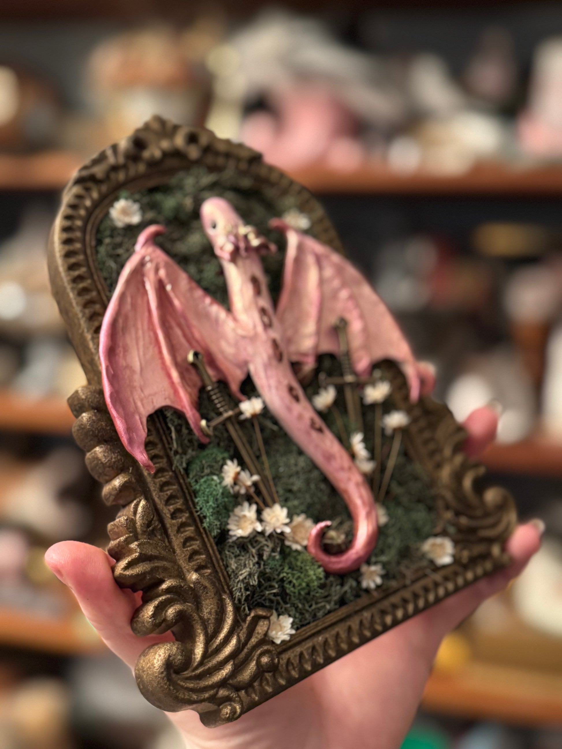 A pink satin dragon on bronze gold frame with florals 5”x7.5”