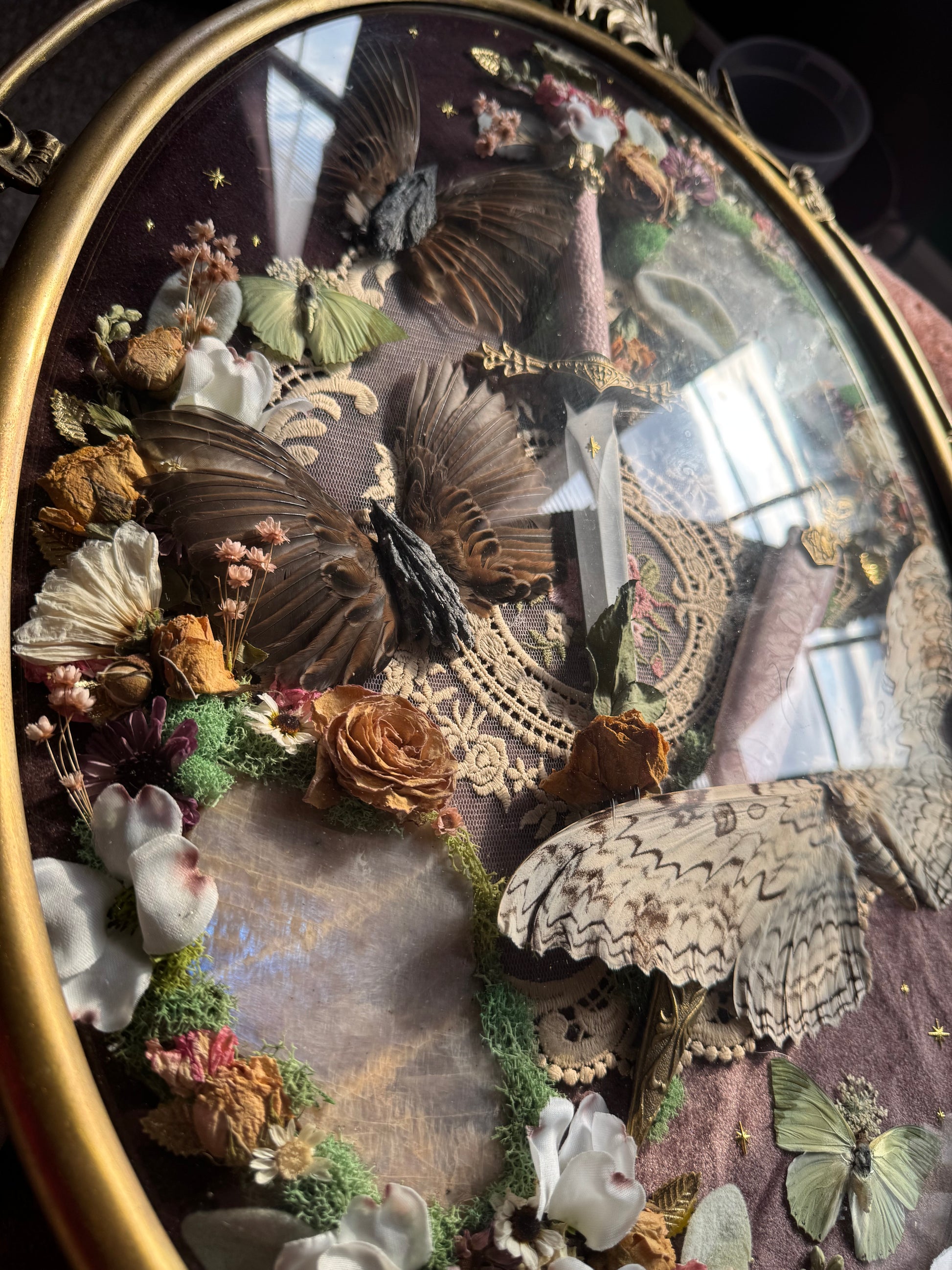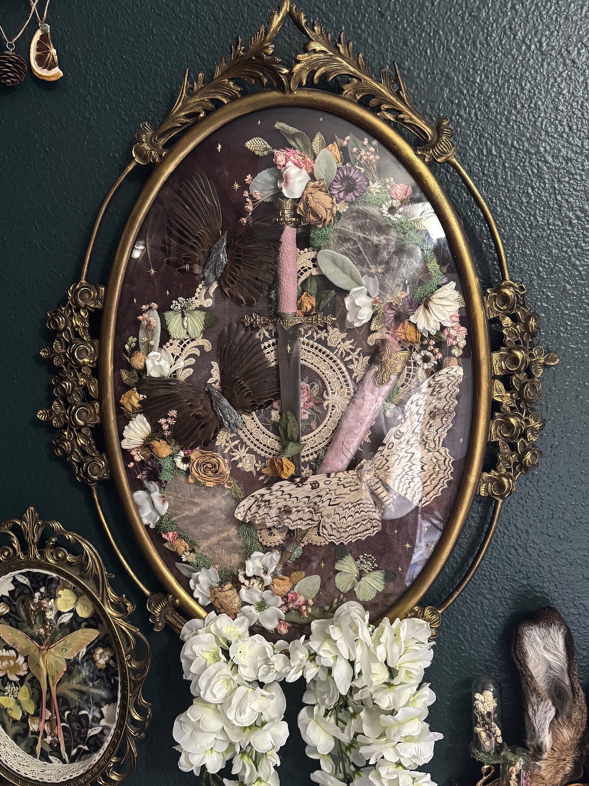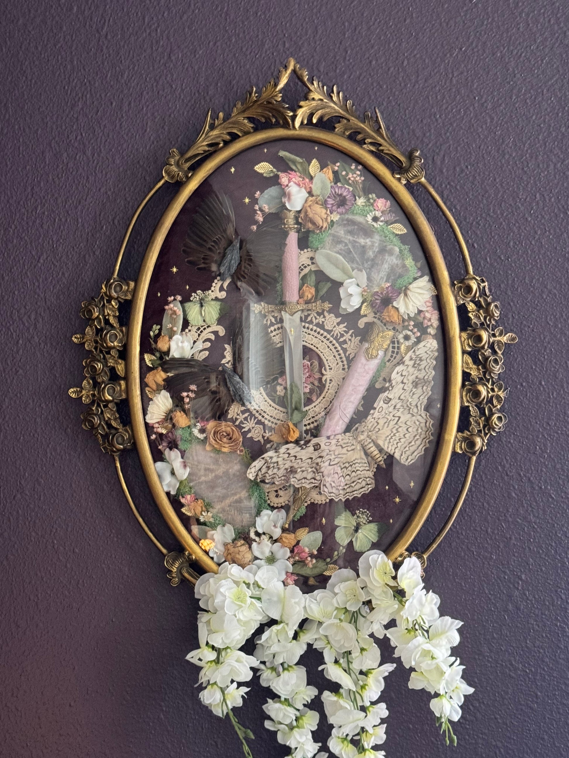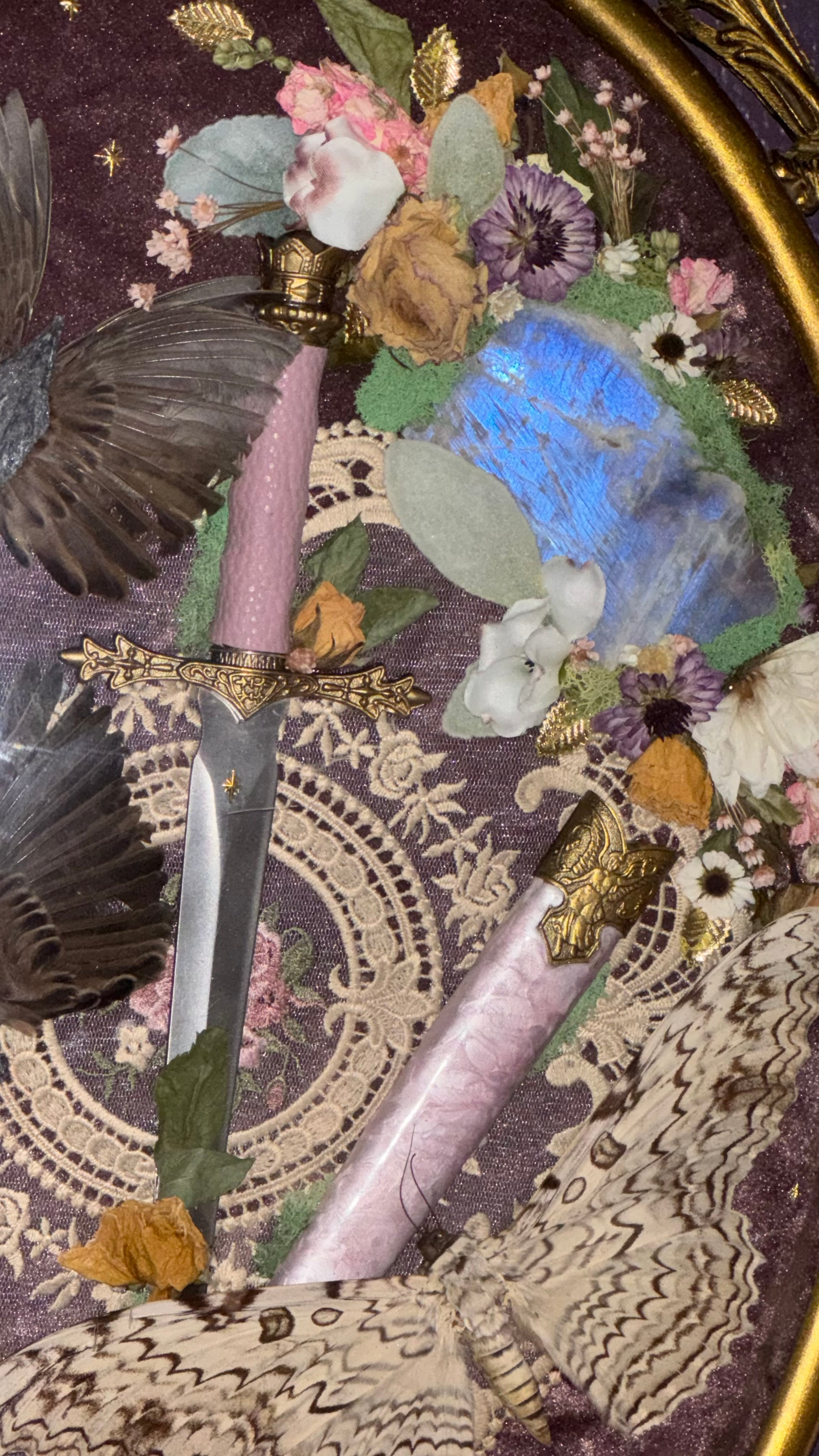 My biggest piece to date. This gorgeous, vintage brass convex glass frame stands at a whopping 24” tall and 21” wide. It features a custom PINK marbled dagger with gold accents. The biggest white witch moth I’ve ever seen, wings spanning about 9” in length, she is accompanied by two green charaxes butterflies and two sets of genuine sparrow wings fastened together with witch’s broom crystal shards. Two pink moonstone slabs incased in preserved moss and a mix of dried and faux flowers over a dull purple velvet fabric with gold twinkle and leaf accents throughout. Hanging white faux flowers on the front to hide to missing metal details on the bottom.