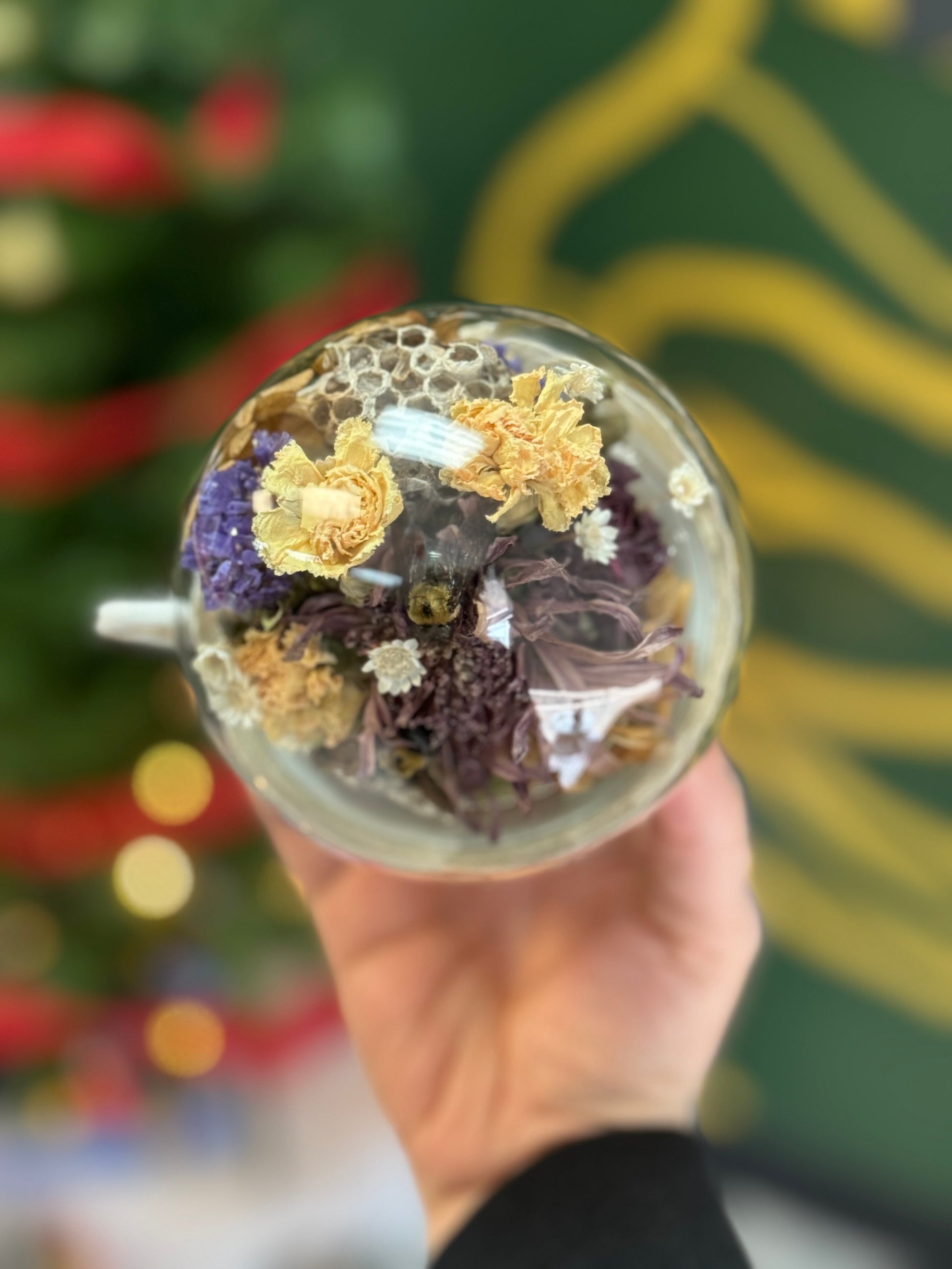 Two fuzzy bumblebees on top of purple chrysanthemum with matching dried florals in a vintage teacup, the saucer is included.