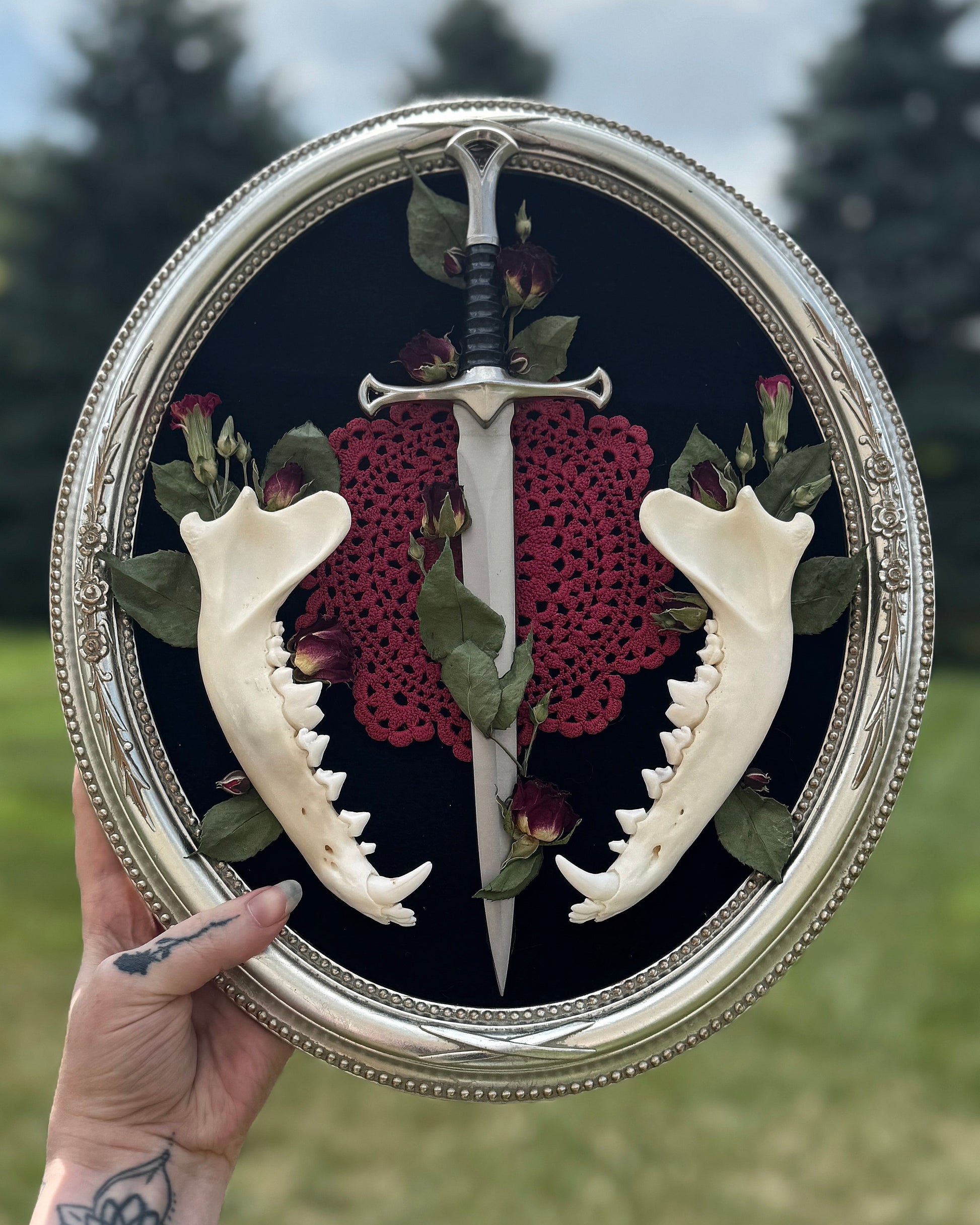This large set of coyote mandibles sits over black velvet, a blood red doily, a real dagger & med mini roses/ carnations all tucked into a large silver frame. This piece can sit or hang.