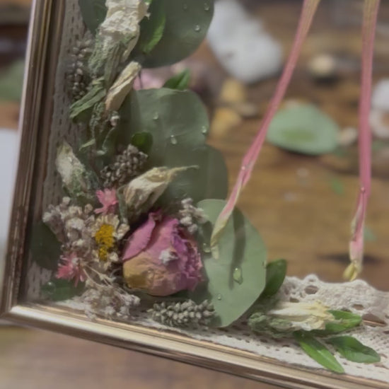 This is a male Chinese luna moth in a custom made double pane, vintage shadow box style frame adorned with dried bell flowers and other matching florals including eucalyptus and star daisies. 5x7” and ready to hang.