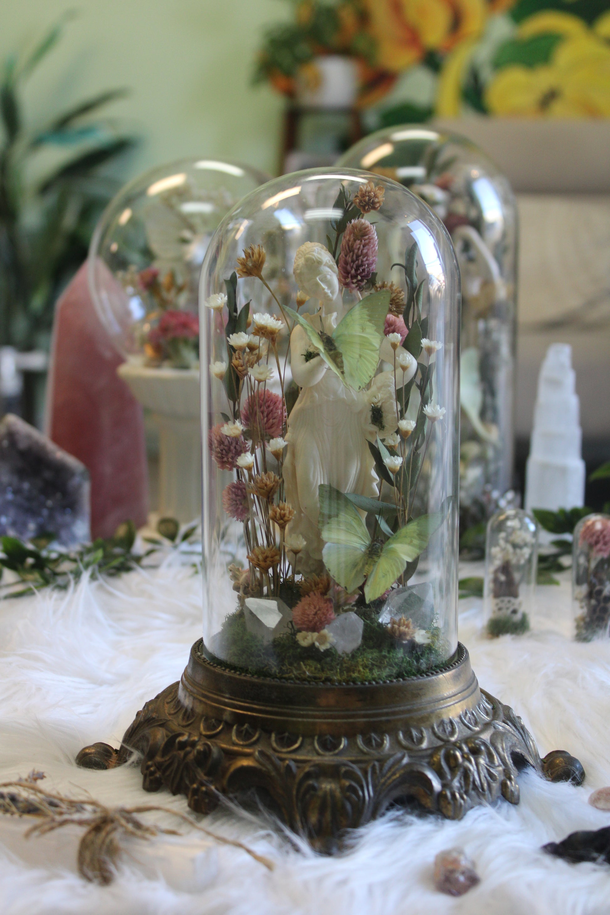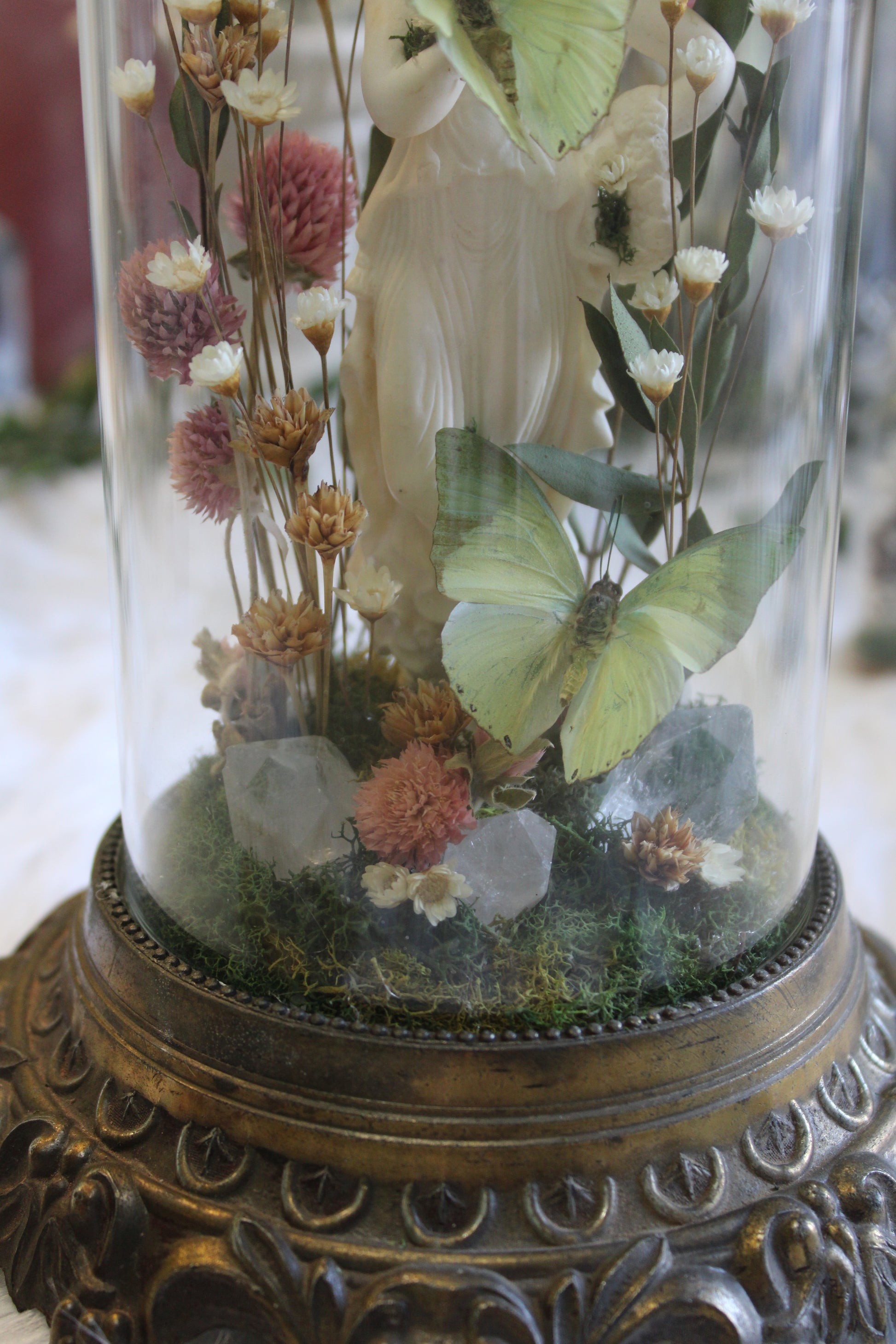 This gorgeous little Greek goddess statue replica sits tucked into a bed of overgrown moss and clear quartz points with two green butterflies perched atop her. Surrounded by a myriad of dried florals on a vintage brass lamp base. Roughly 8” in height with a 6” diameter at the bases widest points.