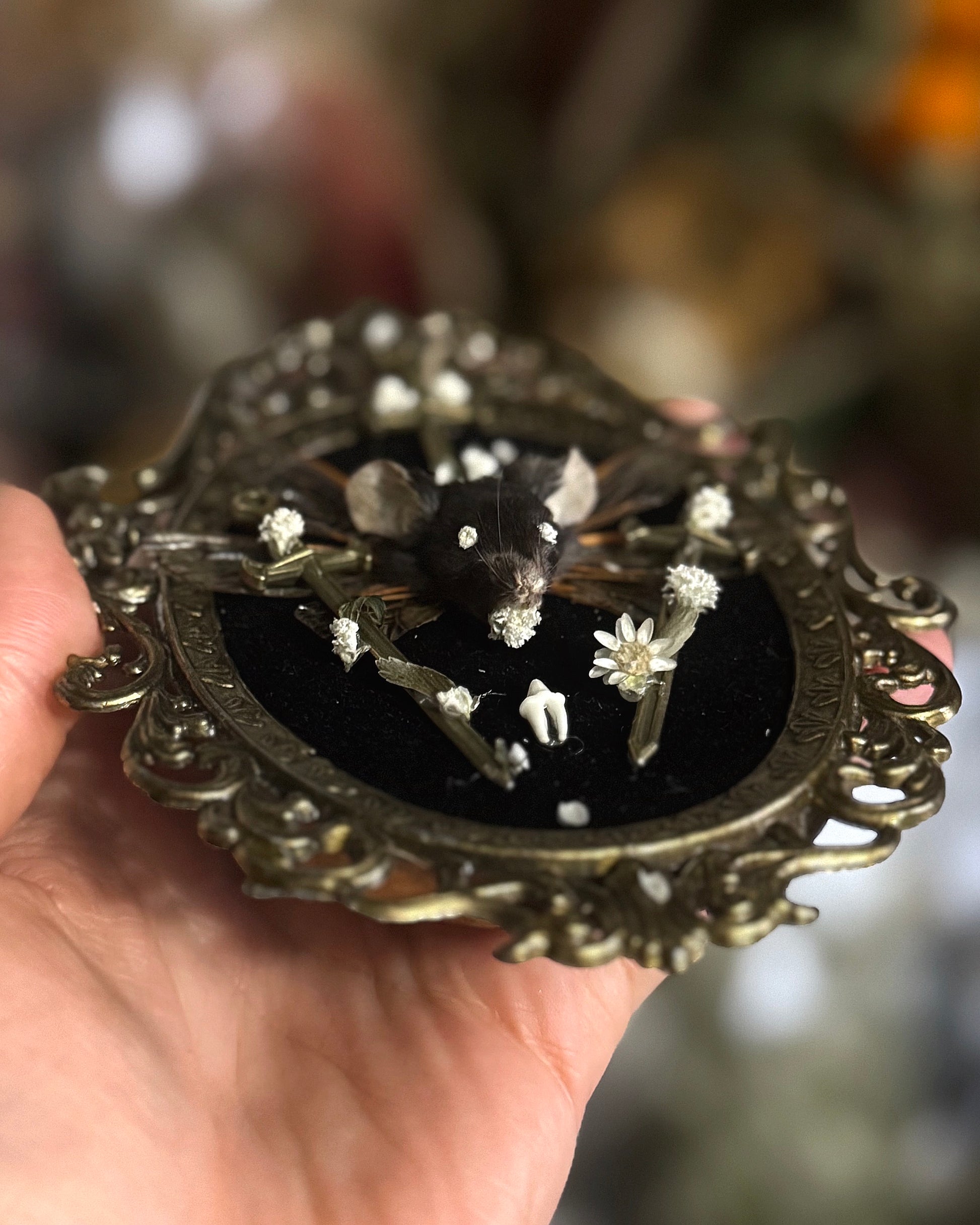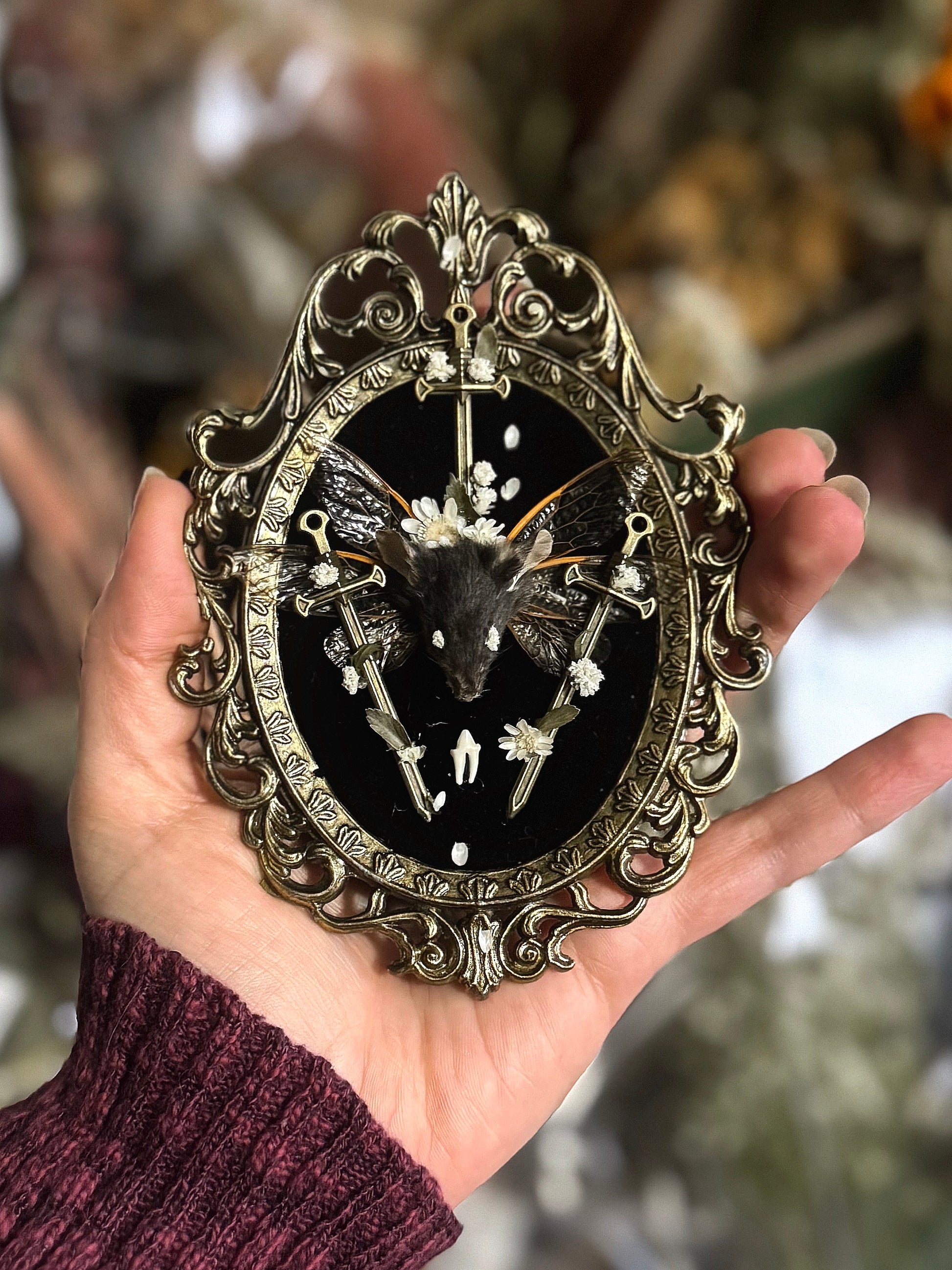 This tiny fallen fae creature is composed of a mummified mouse head with three tiny bronze swords, cicada faerie wings & baby’s breath for eyes mounted on black velvet in a matching vintage, Italian made, cast iron frame.