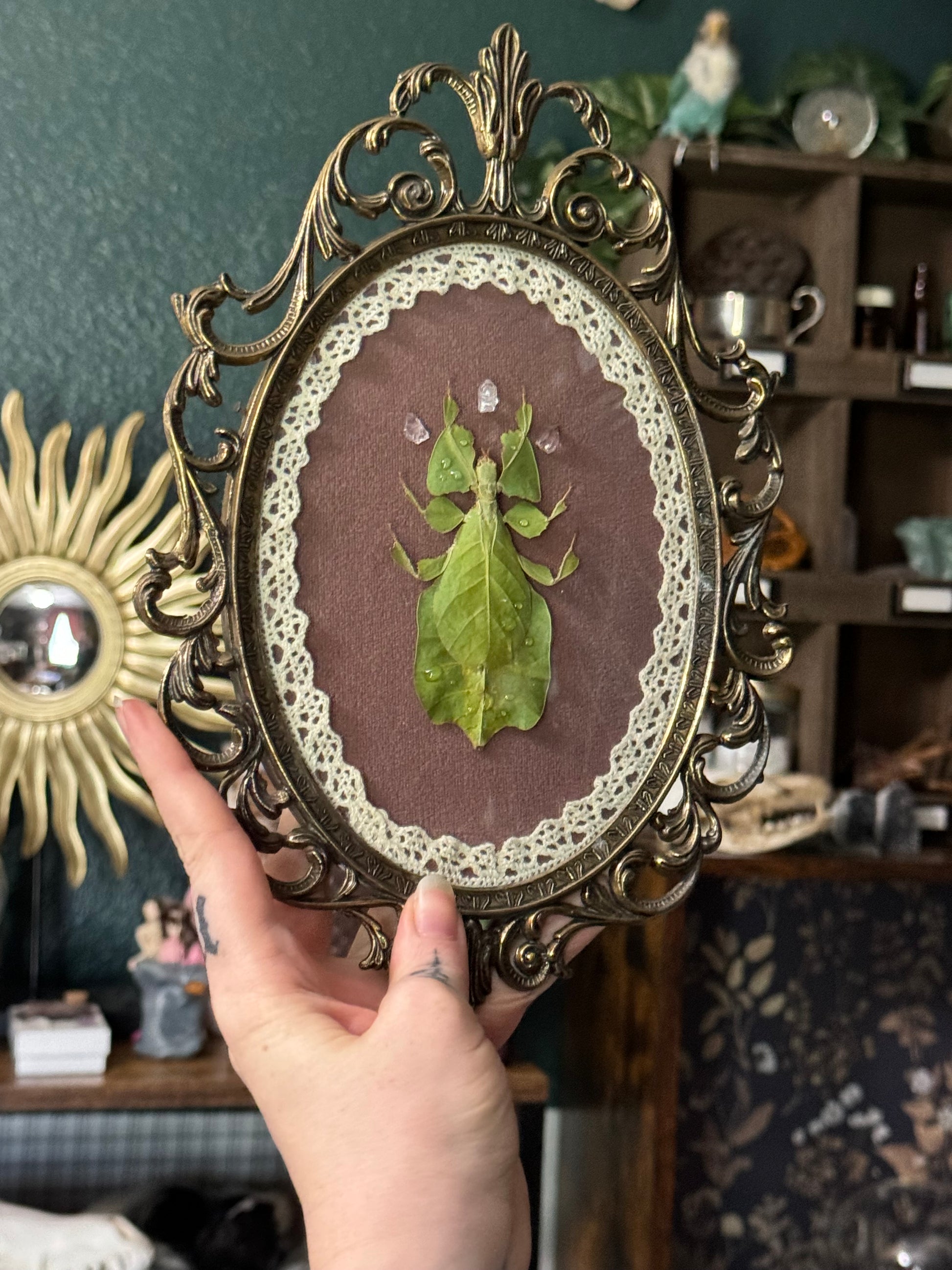 This adorable little leaf bug has been mounted over mauve velvet with cotton lace trim. In a vintage convex glass frame adorned with amethyst points and water droplets.