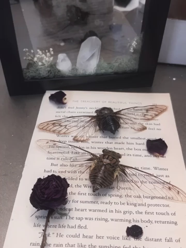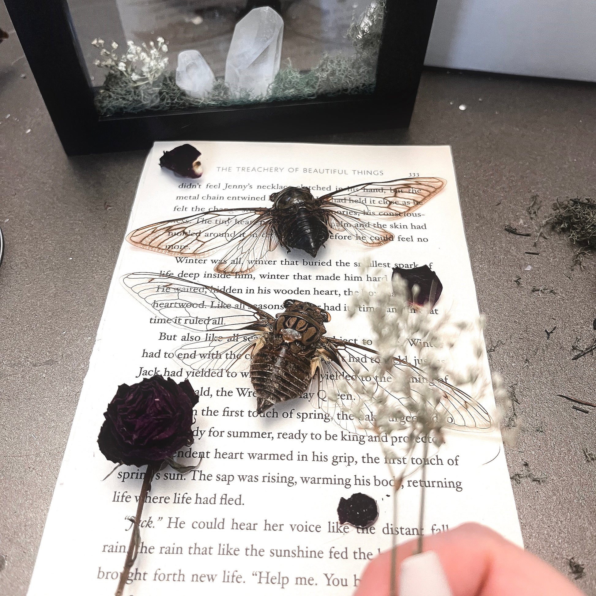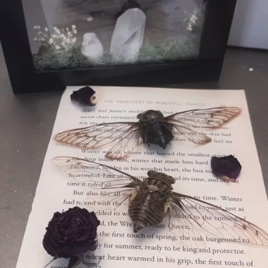 This is a double specimen shadowbox display. Inside you’ll find a male & female clear winged cicada couple, dried florals, clear quartz points & real moss. All atop page 333 from The Treachery of Beautiful Things tucked into a 5”x7” glassy shadow box with bronze filigree corners.