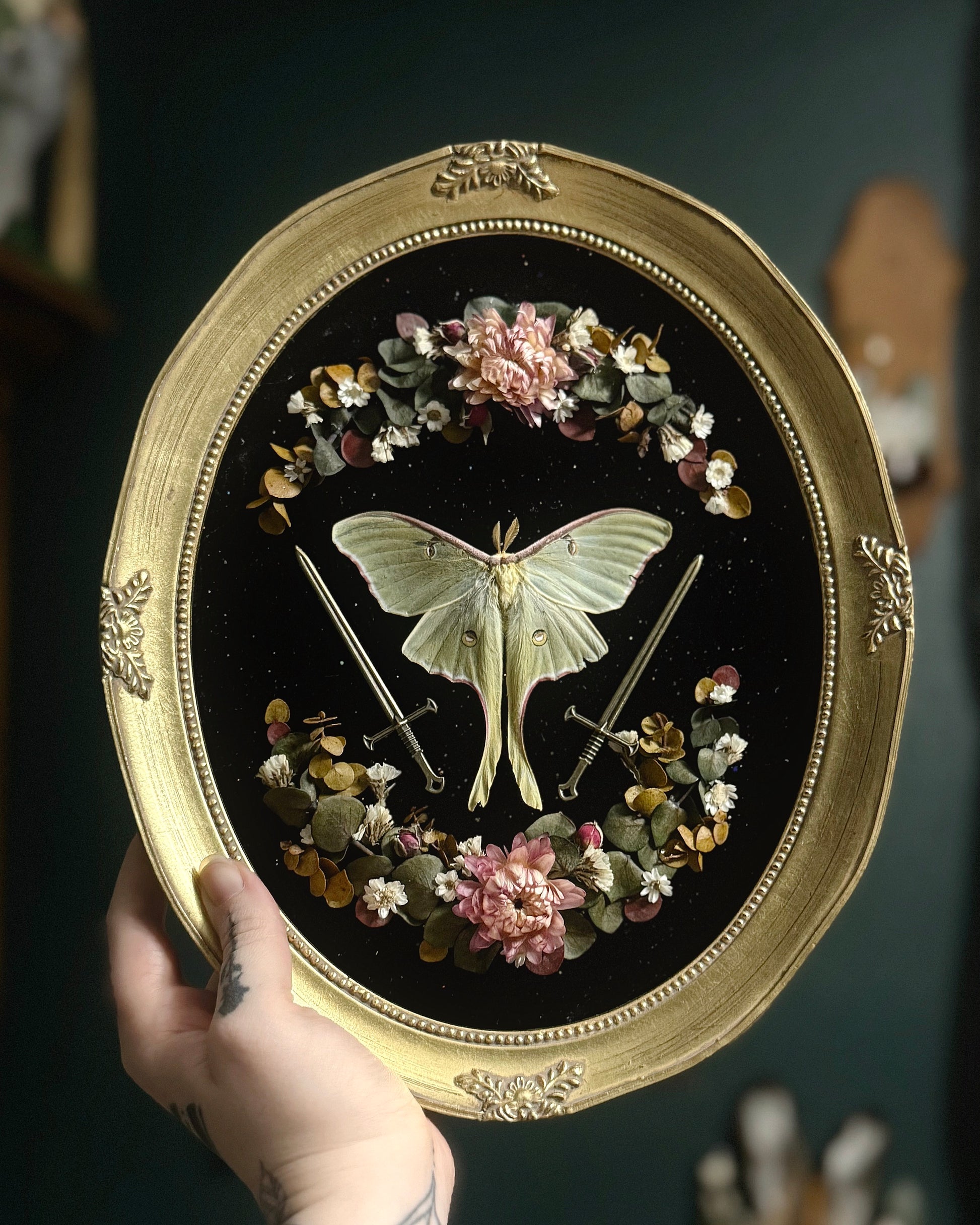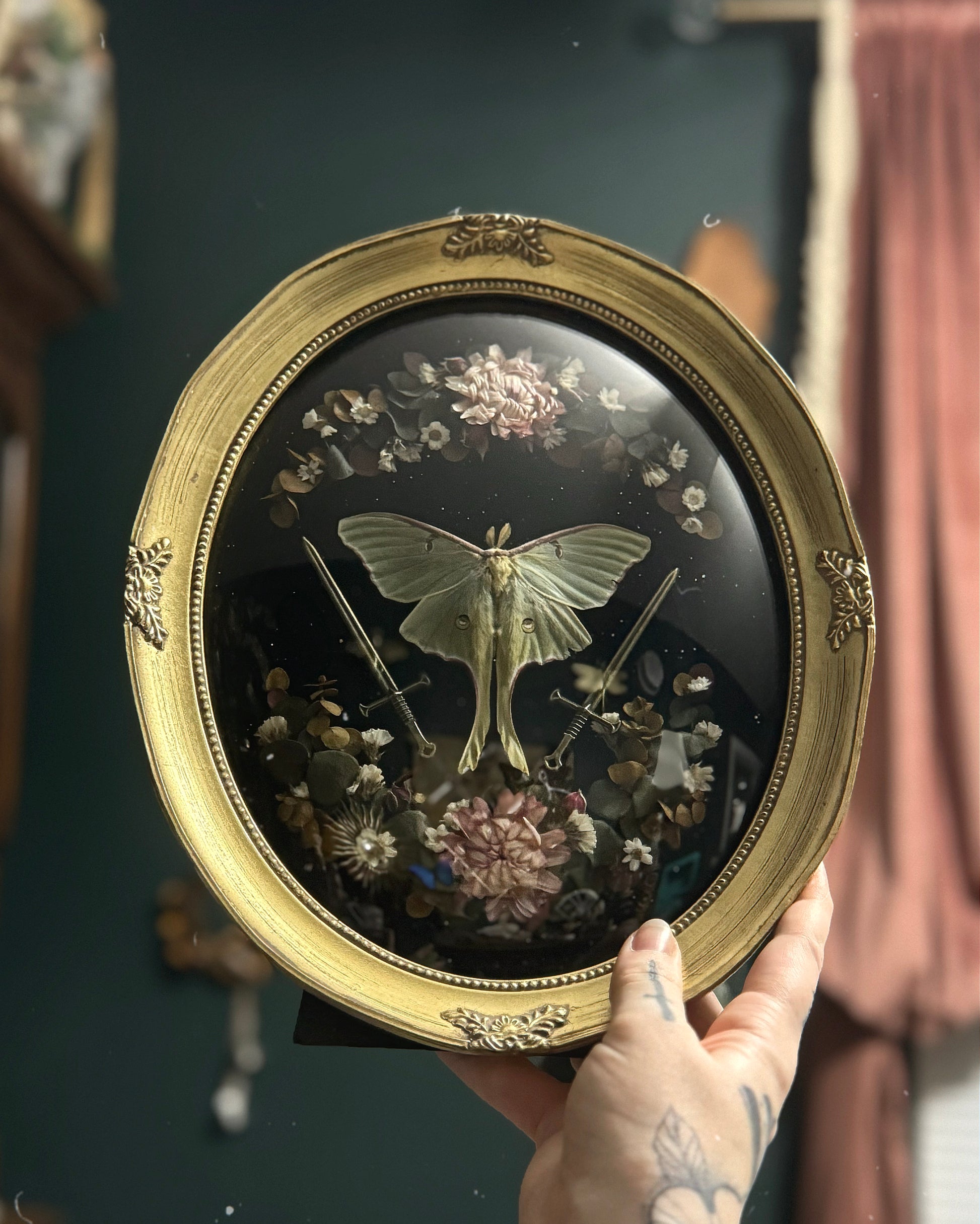 This piece features a male, spring brood Luna moth in an 11.25x9.5” Gold Italian Style Oval Convex Glass frame. With two mini brass long swords and moody florals over black velvet. Can sit or hang.
