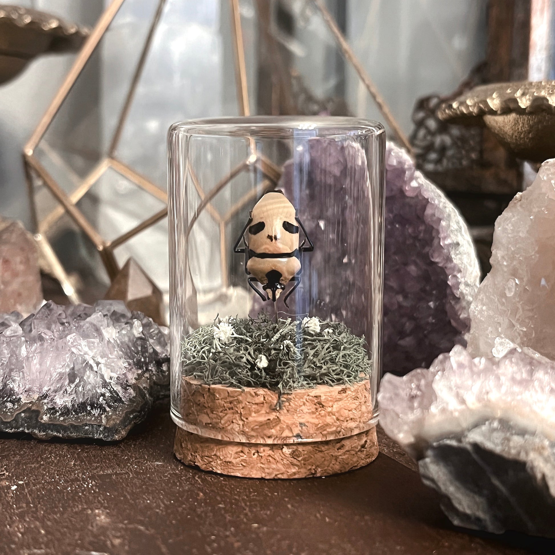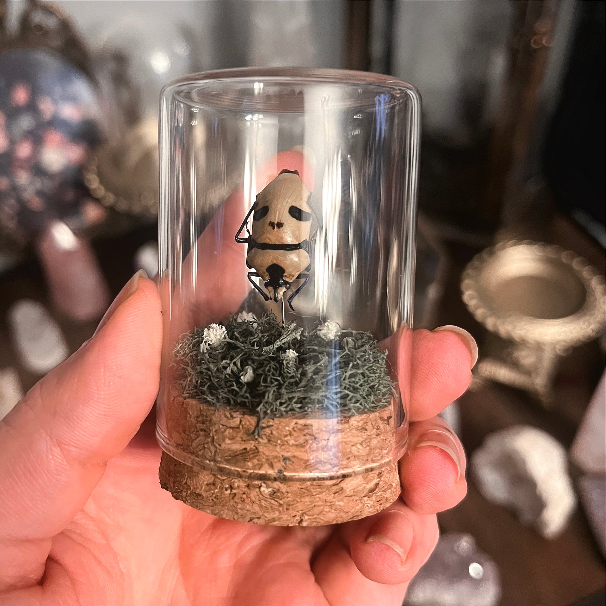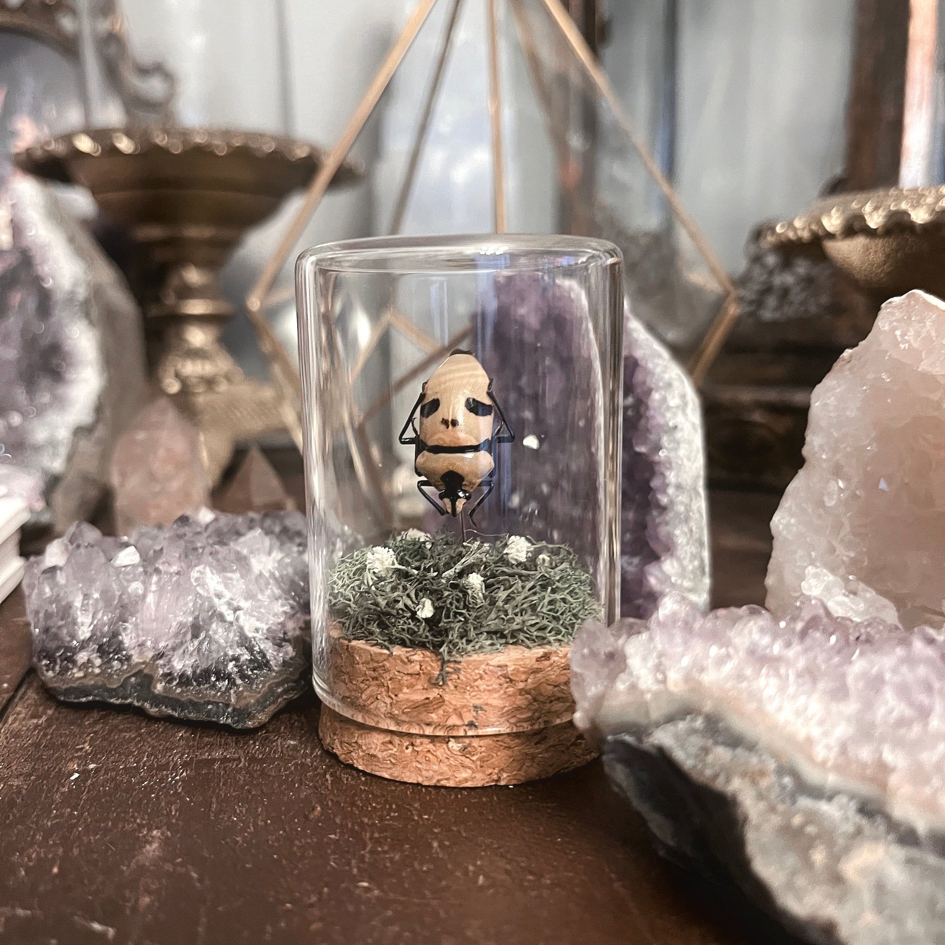 Small floating man faced beetle in simple display jar with cork bottom, moss & baby’s breathe. Cute little addition to your collection.