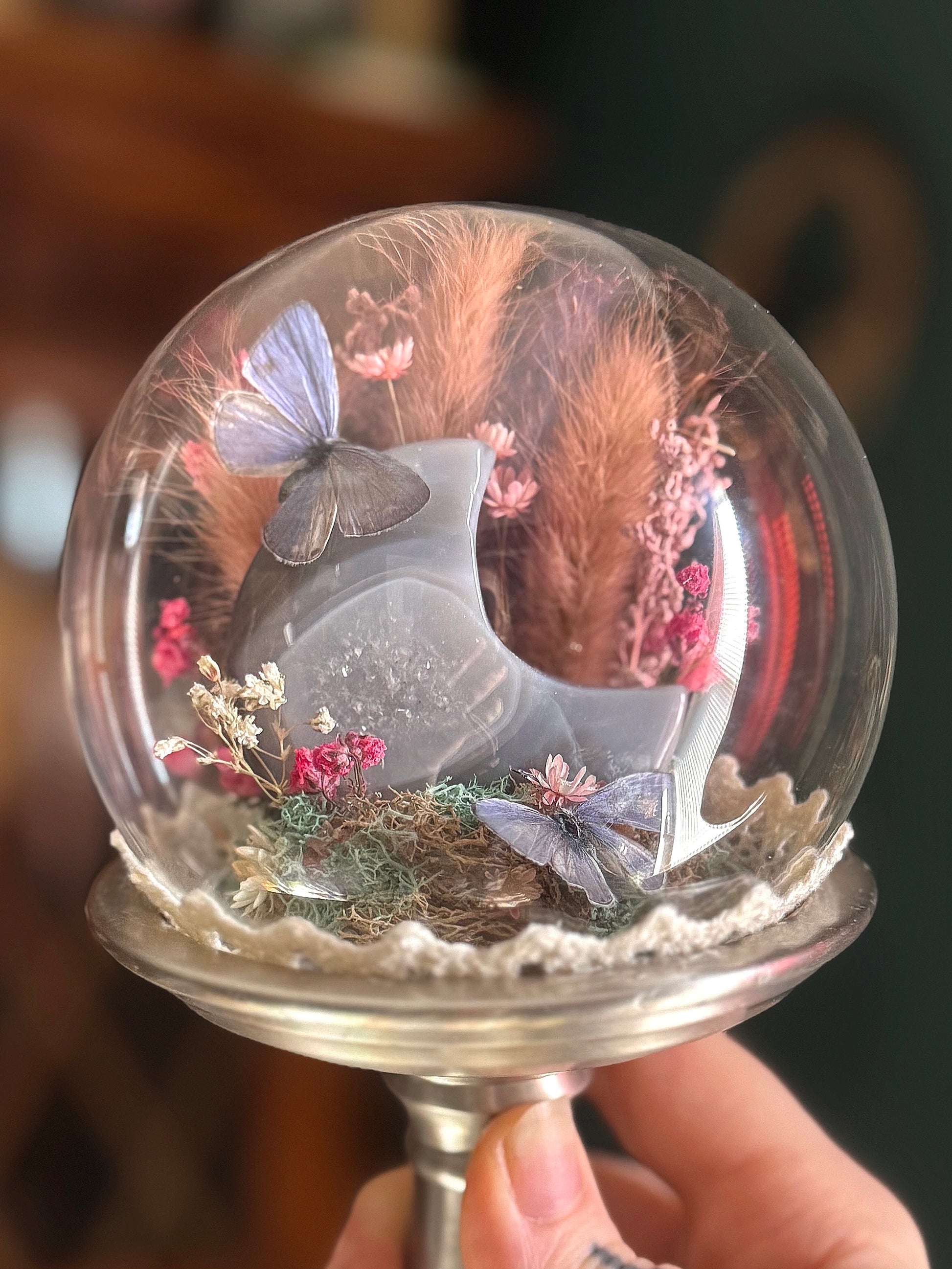 This gorgeous druzy agate moon carving is displayed with two blue hedge butterflies, complimentary preserved florals, a vibrant bed of moss all tucked into a brushed silver base.