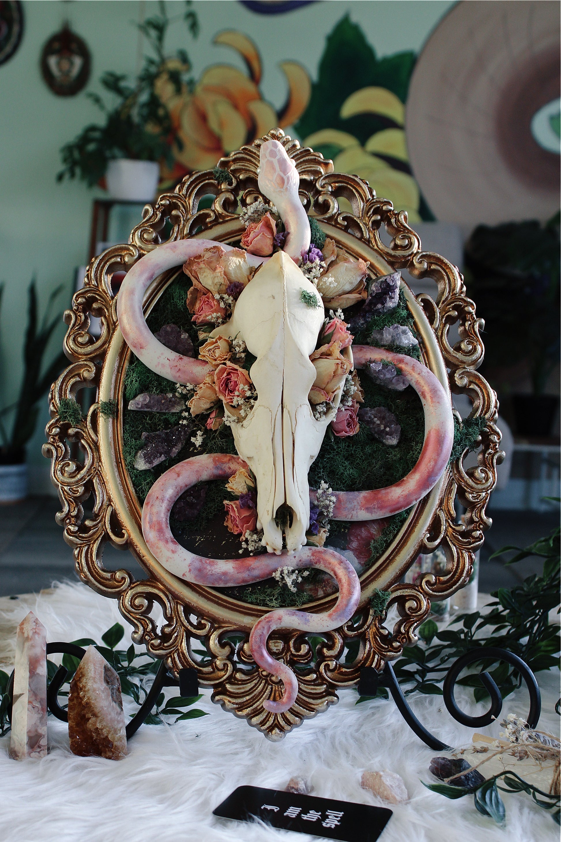 This large polymer clay snake sculpture wraps around a coyote skull. Adorned with dried roses, baby’s breath & amethyst geodes on a gold, filigree frame.