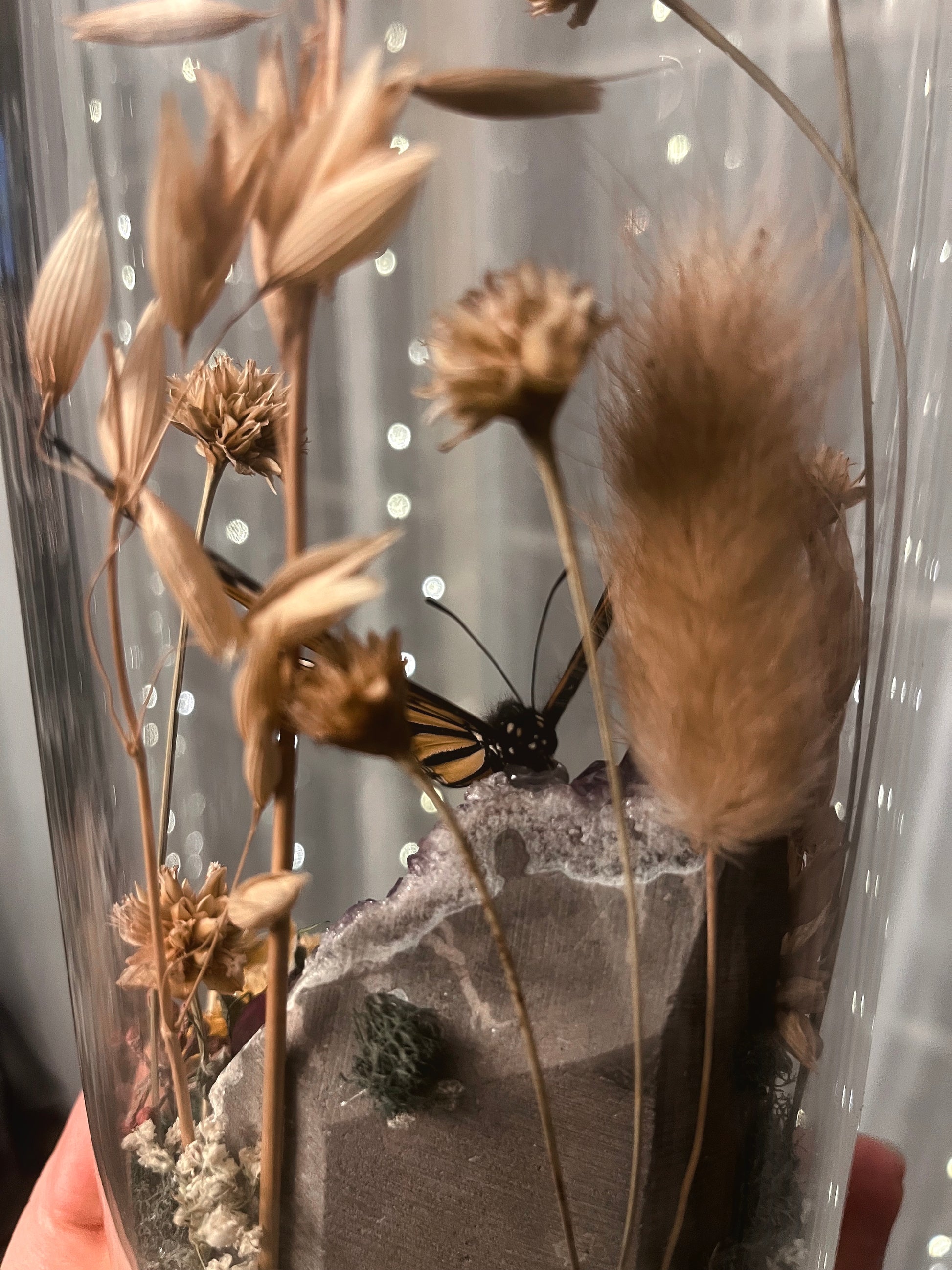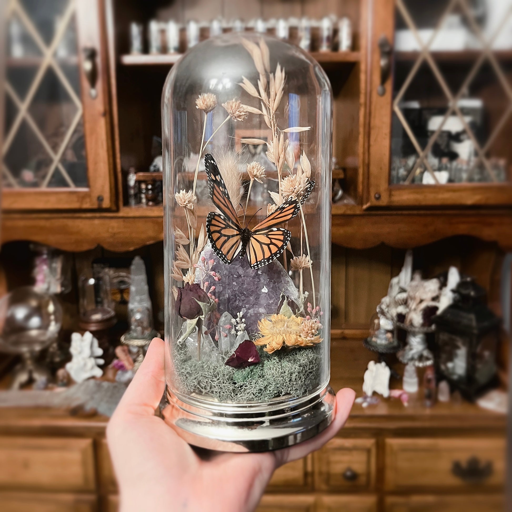 This butterfly dome display features the ever so classic, orange and black monarch. Delicately perched atop a medium sized amethyst cathedral with a various amount of dried florals scattered throughout. A small cluster of clear quartz points is nestled behind some roses & if you turn the display around you can see her peering through to say hello. Approximately 8” high with a 3” diameter. Glass is not removable.