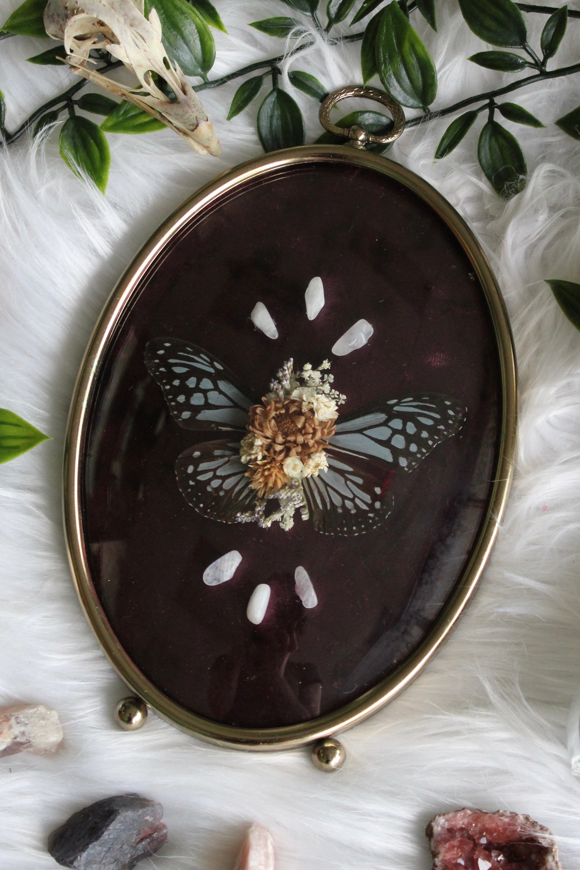 This vintage style bubble glass frame features a set of black and white opalescent wings tucked into a little flower arrangement over a deep purple, velvet background and moonstones displayed above and below.