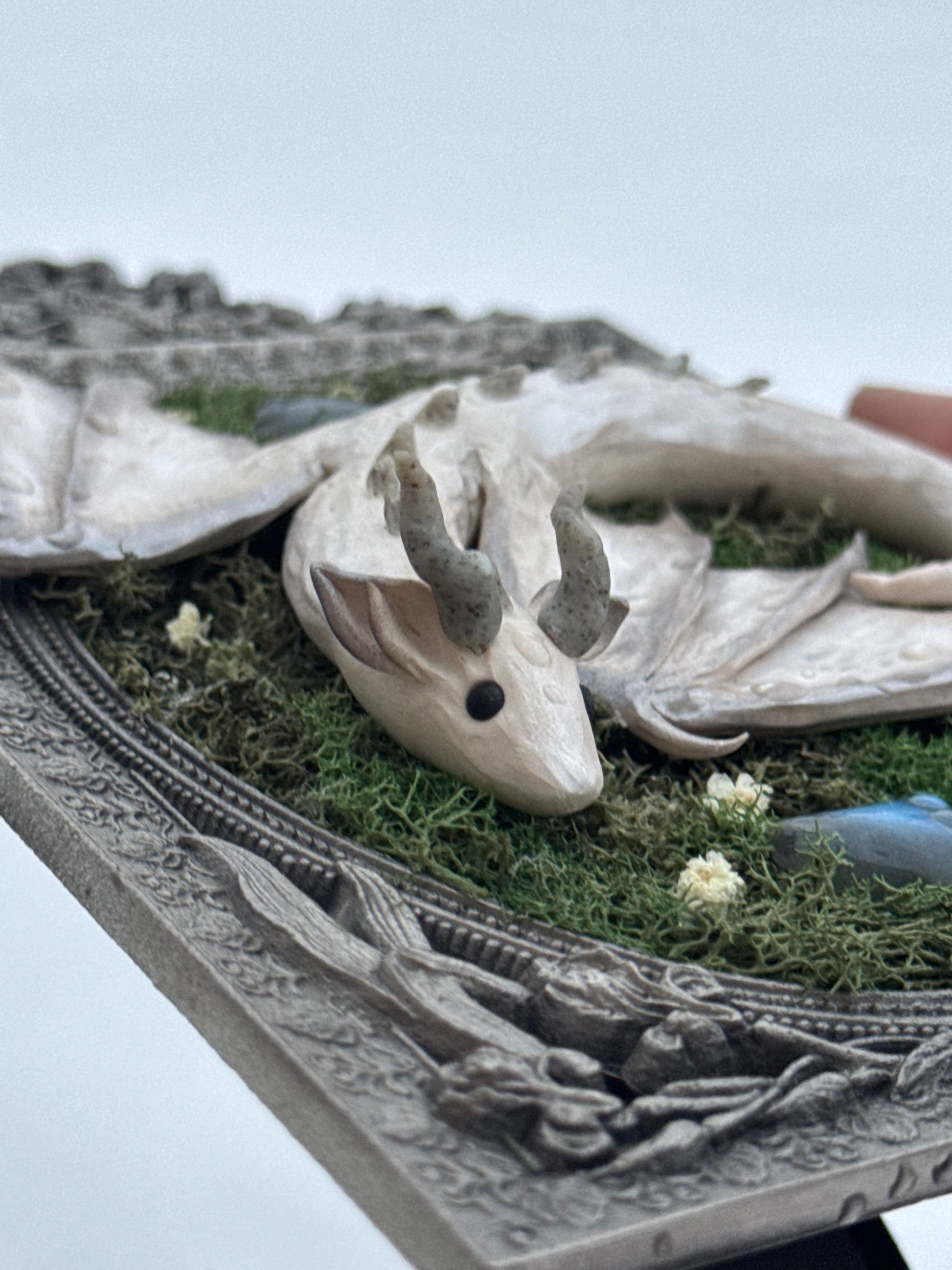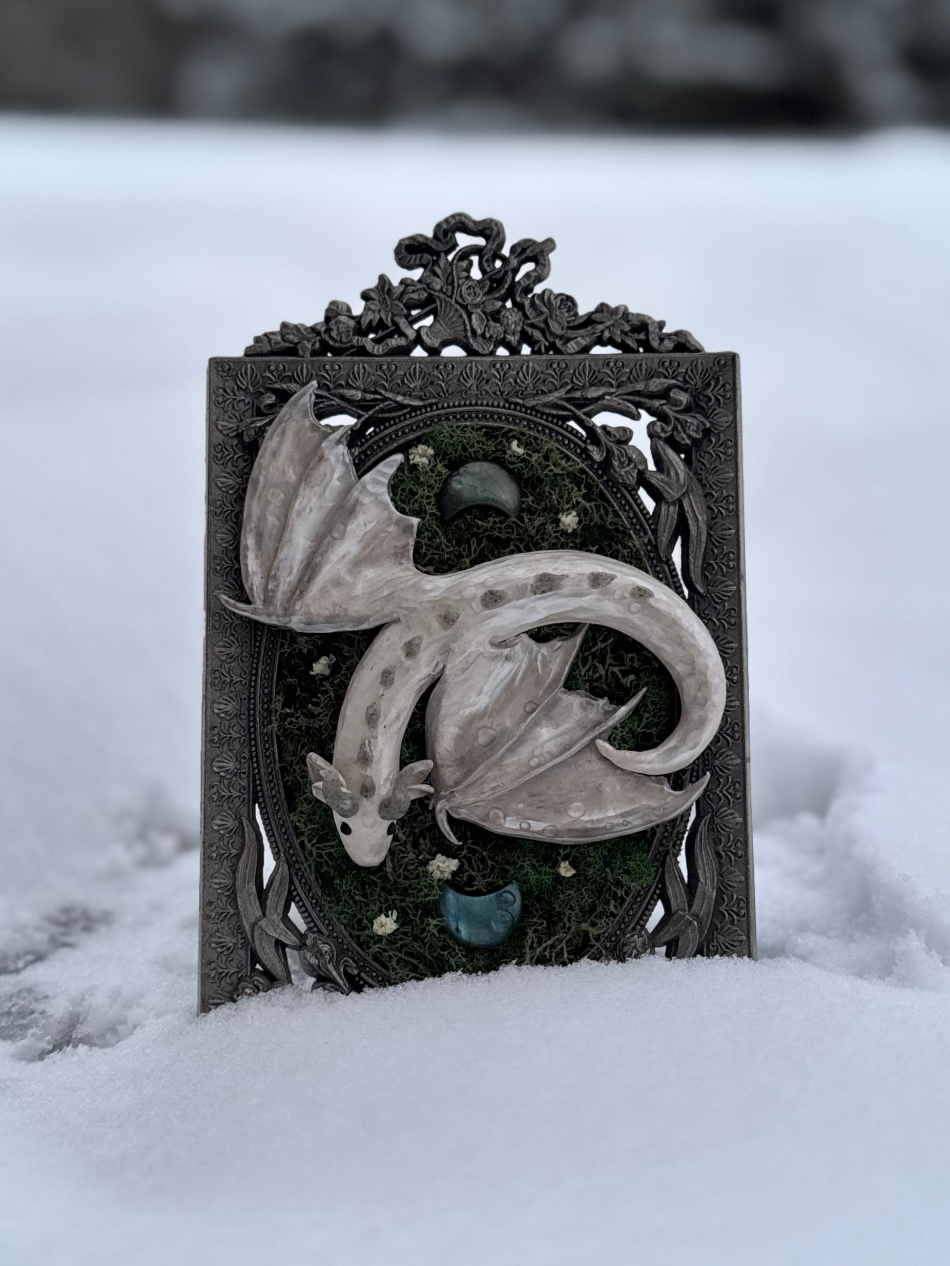 This silver winged baby dragon sits on a vintage silver frame adorned with two labradorite moons over a bed of preserved moss and baby’s breath. Facing downwards this little guy would look best on a higher shelf.