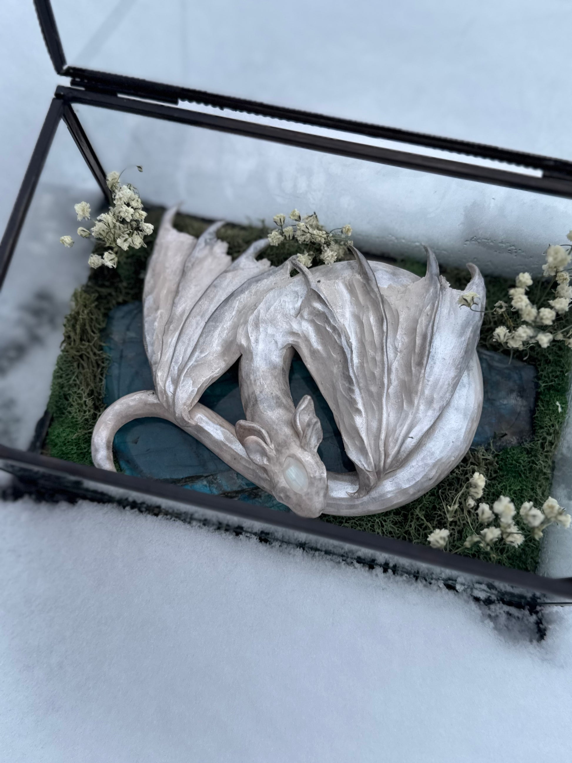 This sweet little silver winged Dragon sits curled on top of a flashy labradorite slab on a bed of preserved boss and baby’s breath. A small moonstone diadem sits on her forehead while she guards her favorite napping spot. Made from polymer clay and mica powders all tucked into a claw-footed, antique, glass jewelry box
