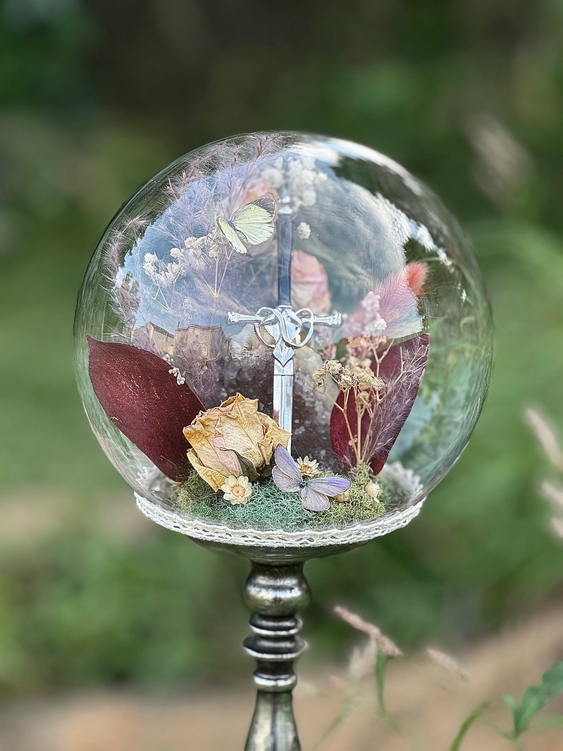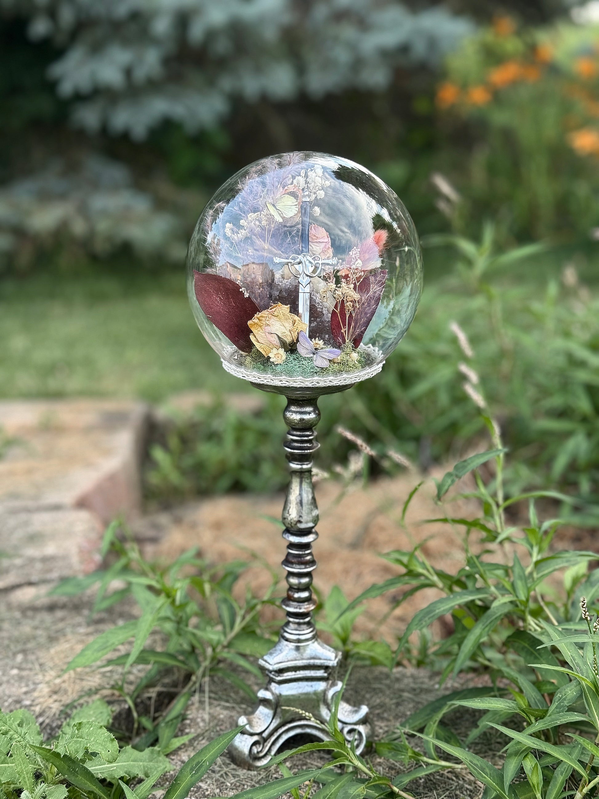 This piece features a gorgeous, elevated silver base with silver long sword and amethyst cathedral. Two little butterflies floating about and a mix of preserved florals. Roughly 12” tall & 4.75” diameter.
