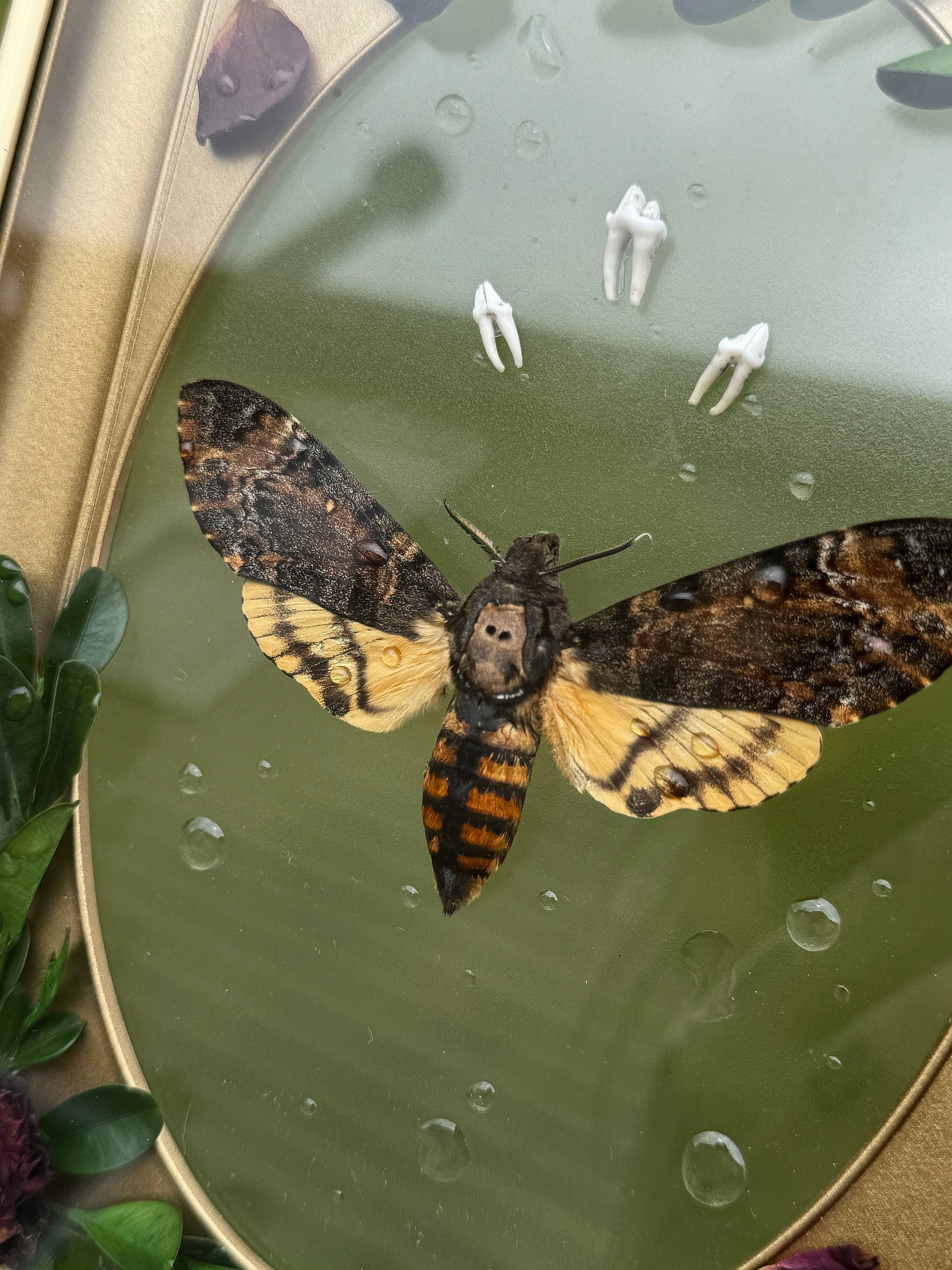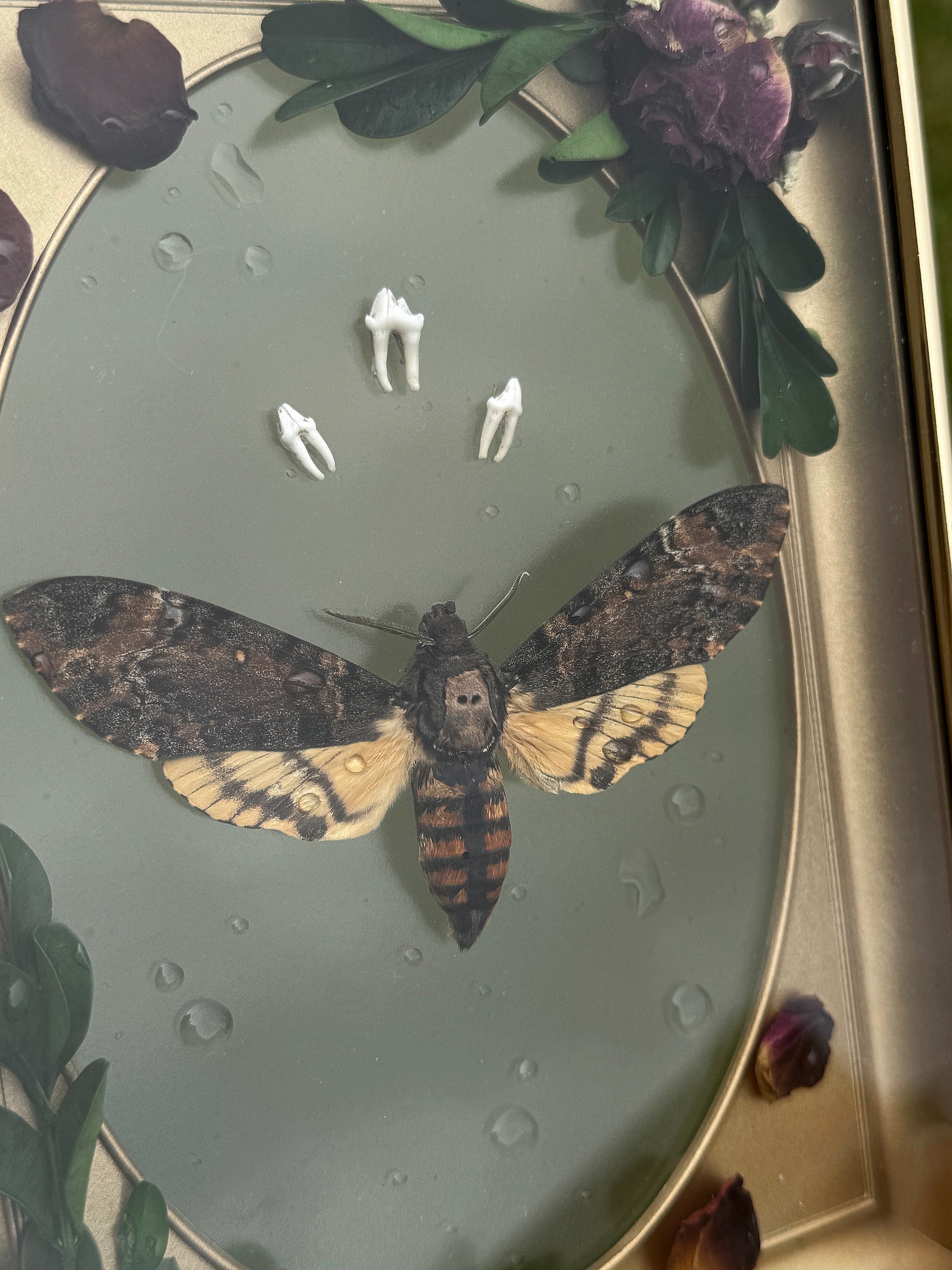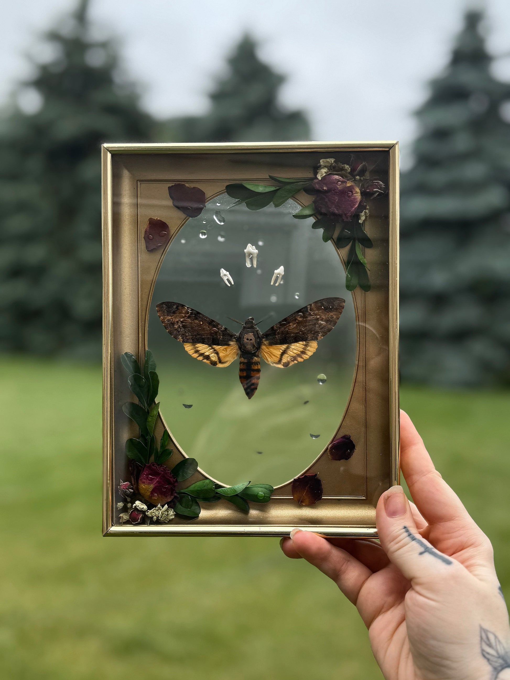 This gold metal frame features a single Deathshead hawkmoth with a trio of opossum side molars hanging overhead with raindrops scattered throughout giving this piece a soft, moody vibe. The glass backing has a foggy appearance to add to the feel as well as red mini red roses and boxwood leaves with petals thrown about. 5”x7” and ready to hang