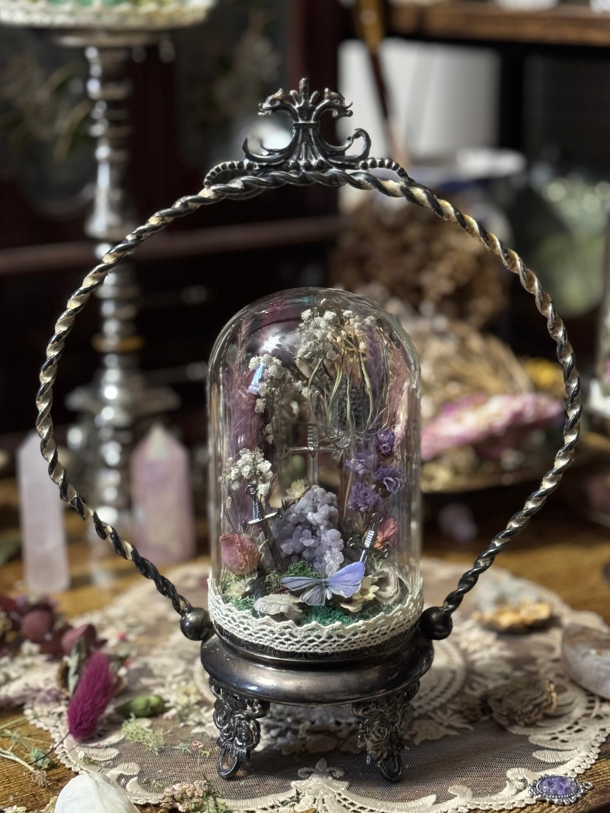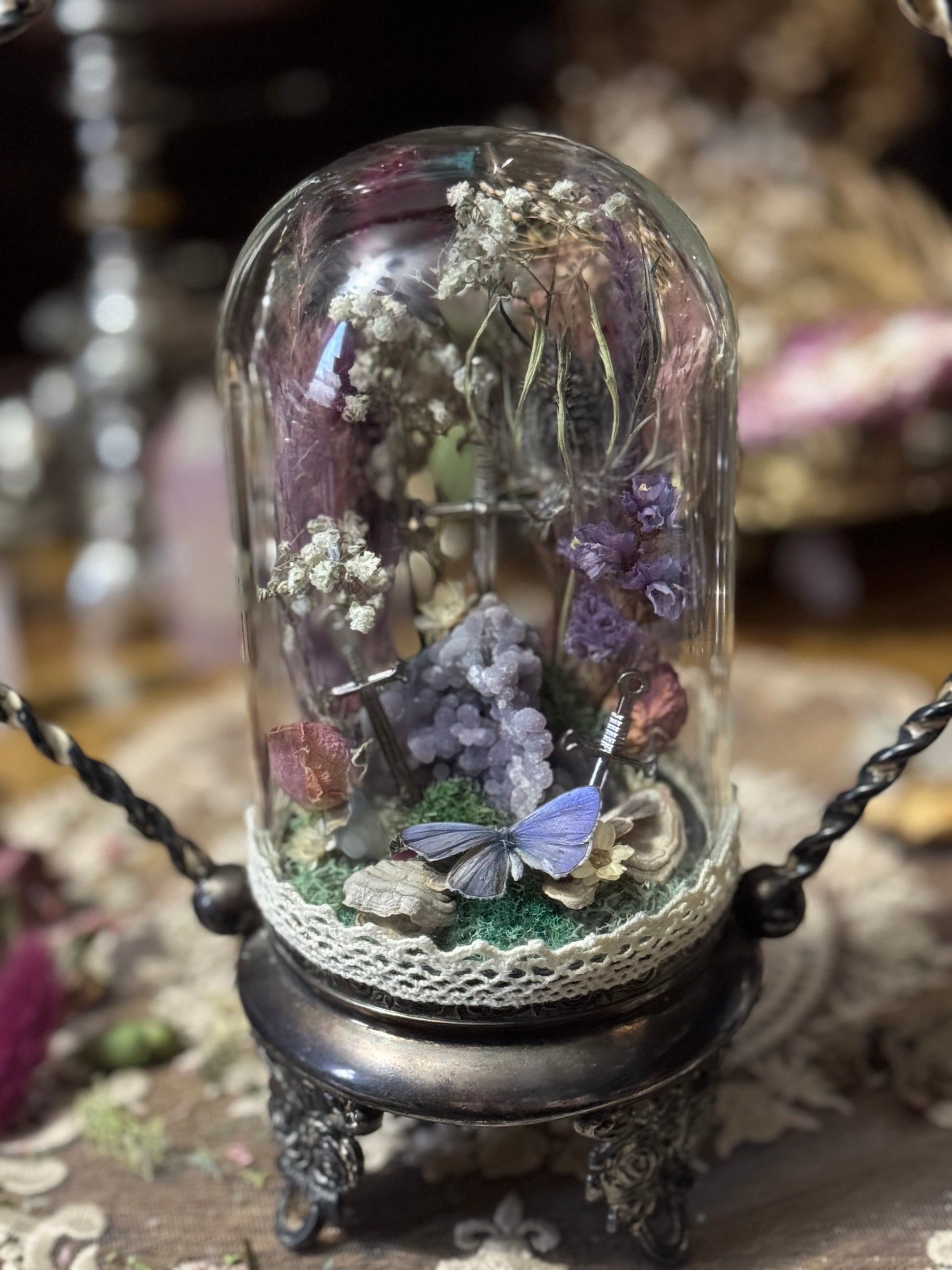 This gorgeous, vintage silver, bridal basket is filled with three matching silver swords surrounding a grape agate cluster, preserved spring florals, a blue hedge butterfly and turkey tail mushrooms all mounted on a colorful bed of moss. Standing at about a foot high at its tallest & 8” wide.