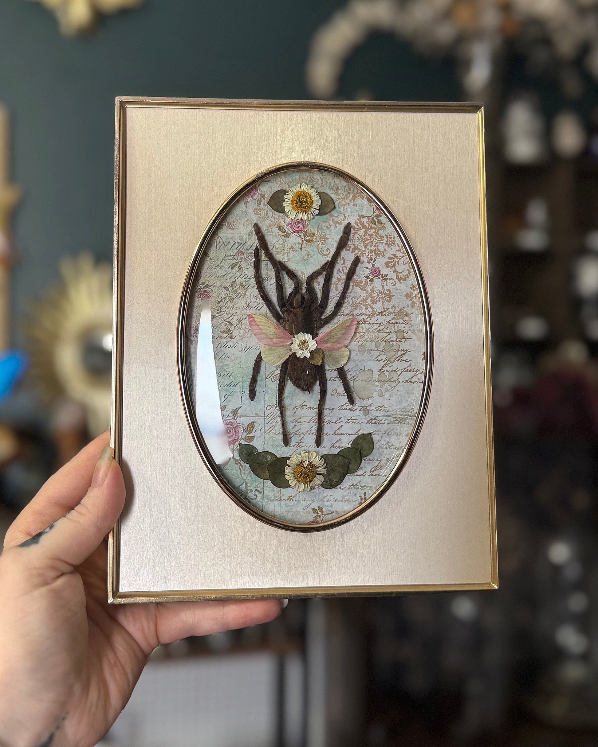 Cute little tarantula fairy with rosy maple moth faerie wings, Shasta daisies & eucalyptus over scrapbook paper in a vintage convex glass frame. 5” x7” in total, can sit or hang.