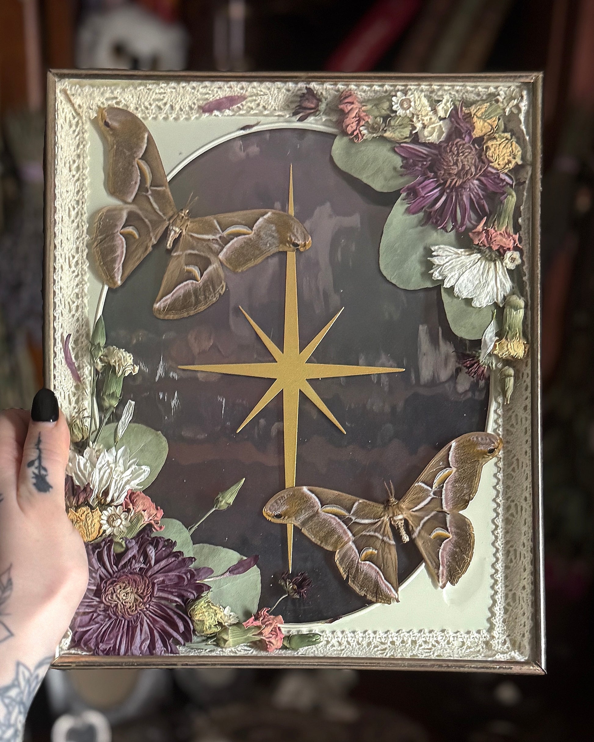 This gorgeous pair of male Cynthia moths dance around a big gold star, mounted over stained glass w a slight iridescent shine. Accompanied by dried florals and cottagecore cotton lace this beauty stands at 8”x10” and is ready to hang.