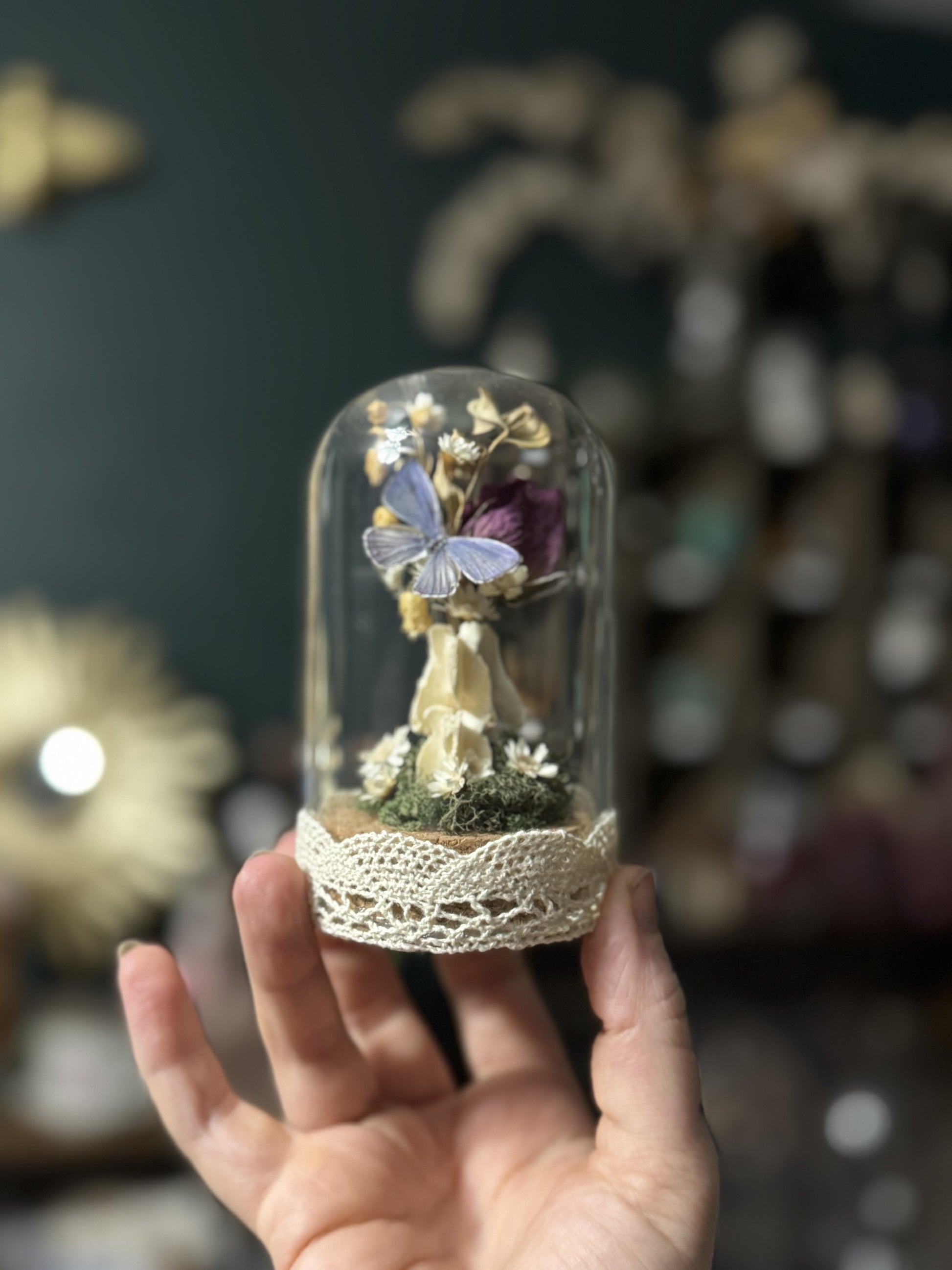 This cute little display cloche features a miniature vertebrae bouquet with a pink mini rose, other florals, a bed of moss and a preserved common blue hedge butterfly. All wrapped up with scalloped lace trim.